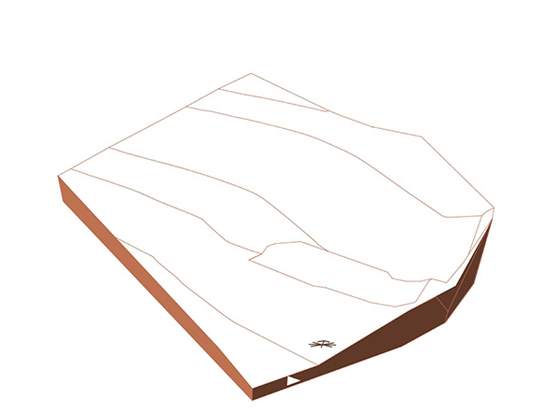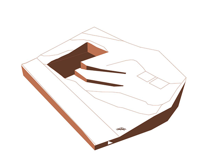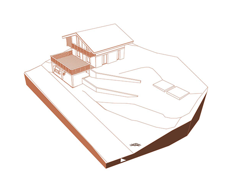 L’implantation de la construction dans l’angle Nord de la parcelle permet de libérer un maximum d’espace sur le terrain. Le soubassement en béton, qui abrite une cave et un garage, assure l’assise du projet dans la pente tout en surélevant la partie habitable