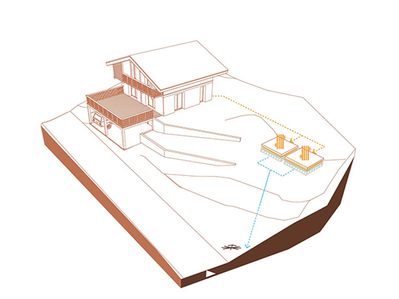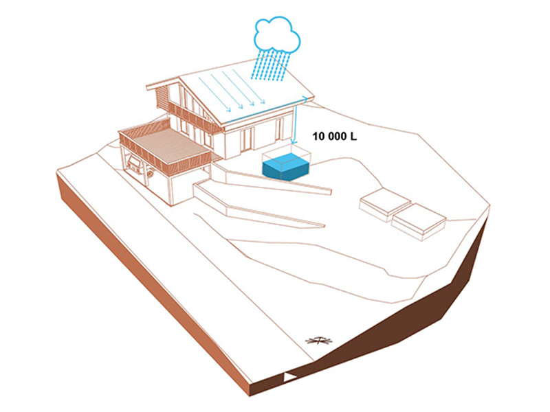 Situé dans un zone d’assainissement non collectif, un système par phyto-assainissement autonome nécessite l’implantation de deux bacs à roseaux étanches de 10m² chacun, qui seront positionnés à proximité de l’accès au terrain. Une citerne de récupération et de stockage des eaux de pluie sera également enterrée à proximité de la maison, pour l’arrosage du jardin.